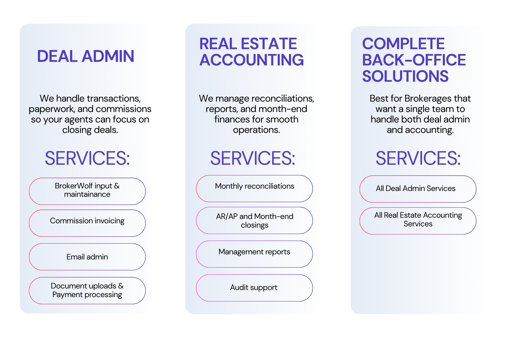Services Built for Canadian Real Estate Success—Whether you’re running a brokerage or building your agent business, we provide expert support across every administrative function—so you can focus on growth, not paperwork.